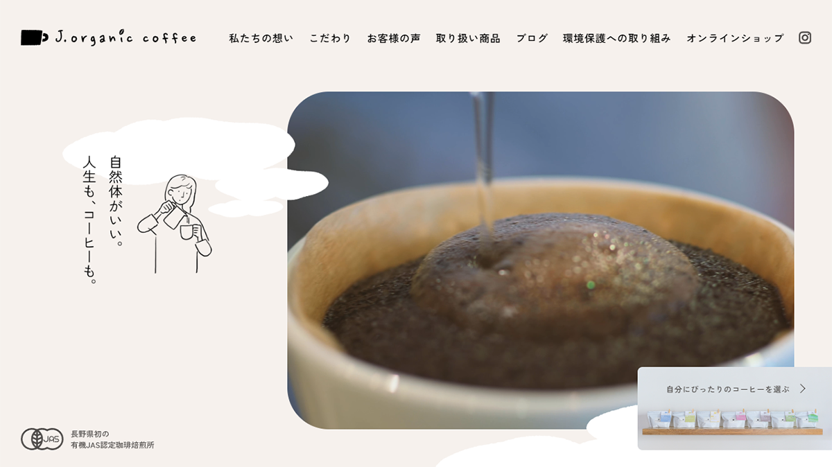 J. オーガニックコーヒーは、手書き風のイラストを入れることにより、ホームページ全体で温かさのあるデザインを演出しているのが特徴です。