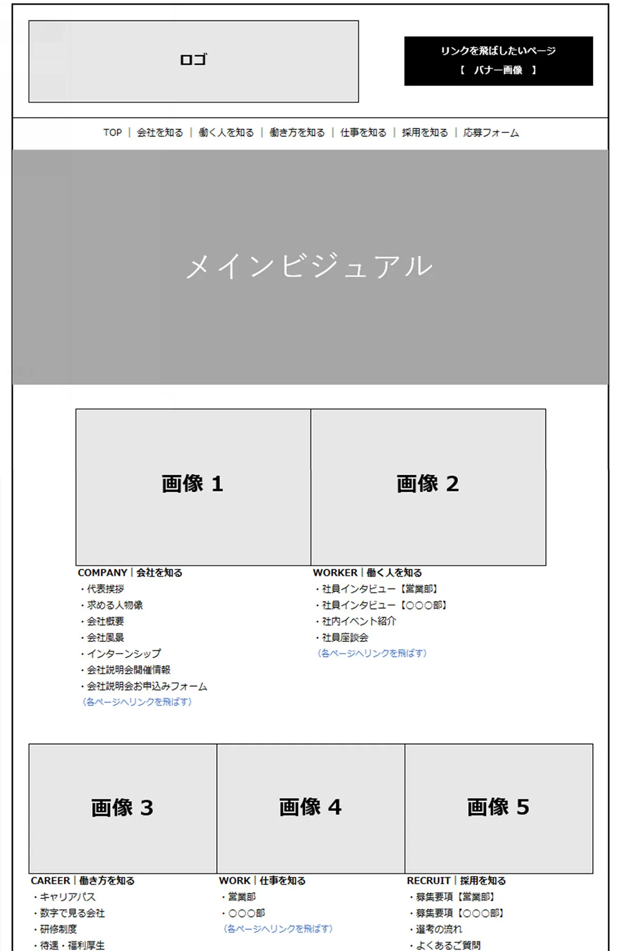ワイヤーフレームは全ページ作成するわけでなく、トップページや複数のページのテンプレートデザインになるようなページを主に作成します。