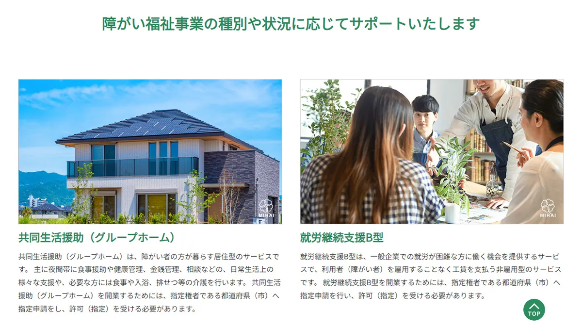 本記事で紹介した「行政書士未来法務事務所」では、障がい福祉事業のサポートとわかるようなコンテンツを掲載しているので参考になるでしょう。