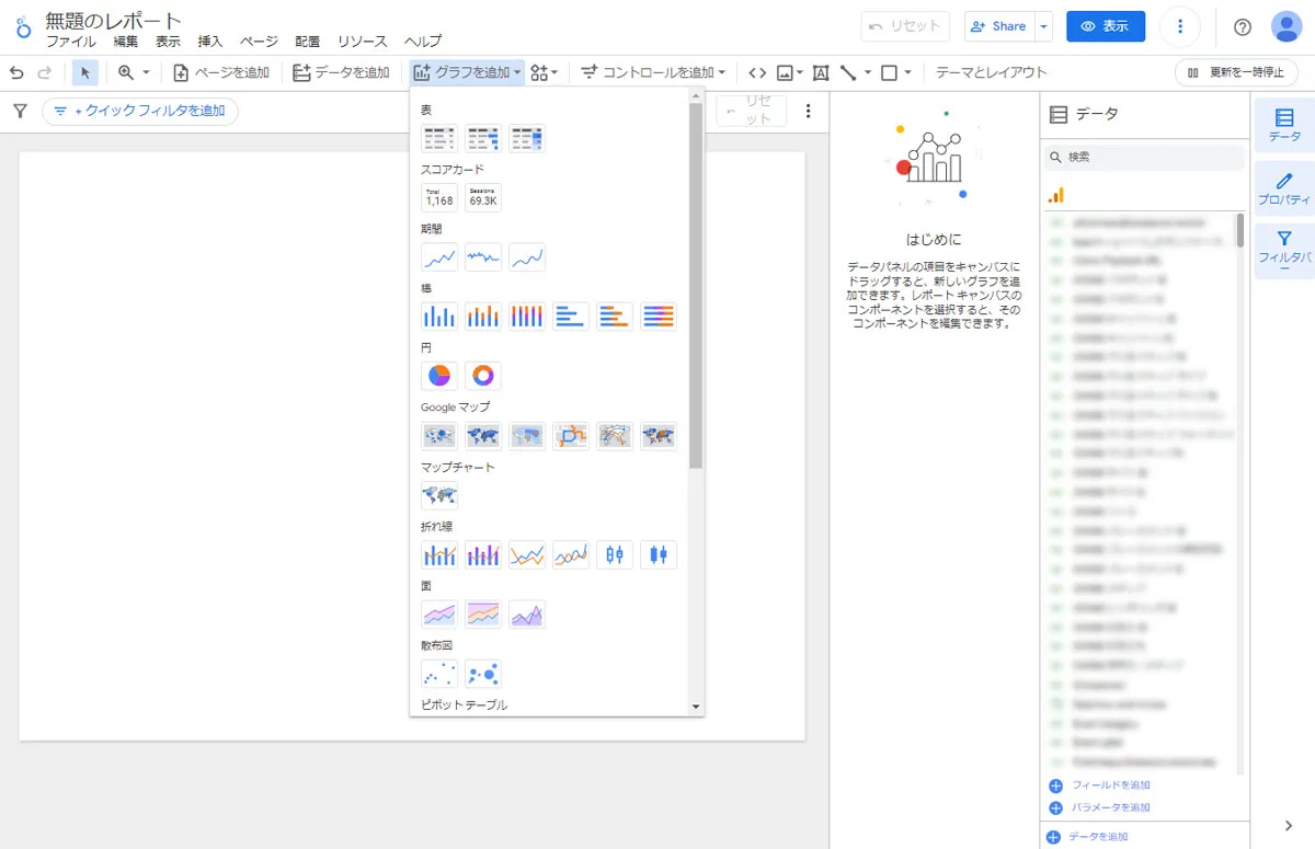 追加が完了すると、レポート内に表組テンプレートと右側のデータタブ内にアナリティクスのデータ情報が表示されれば連携完了です。