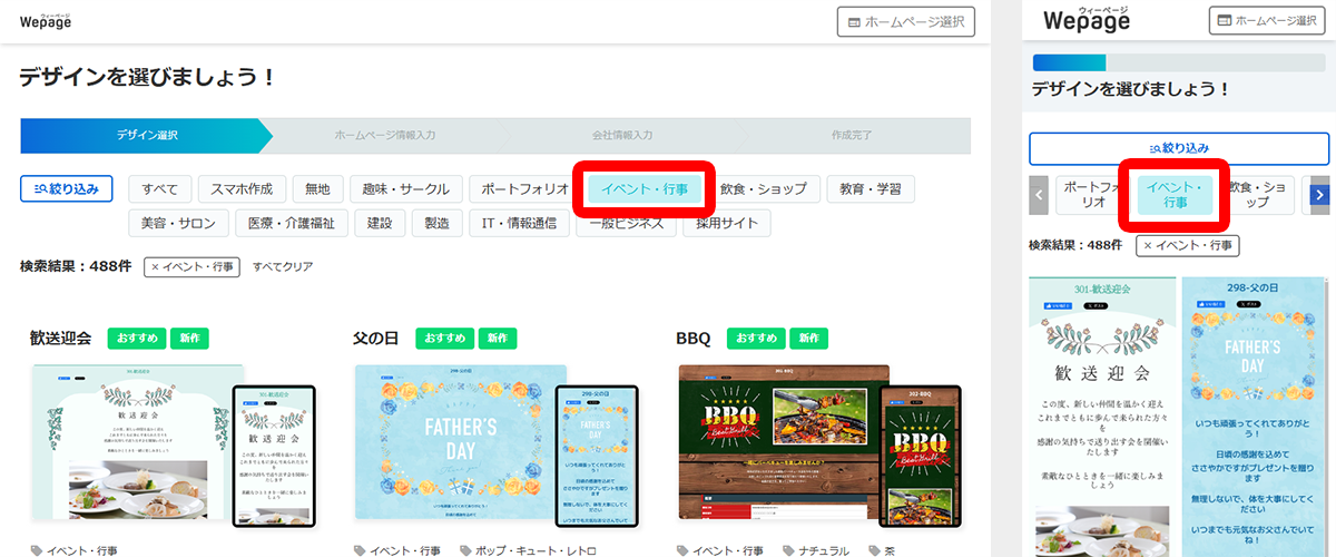 デザイン選択画面上部で「イベント・行事」ボタンをクリックします。