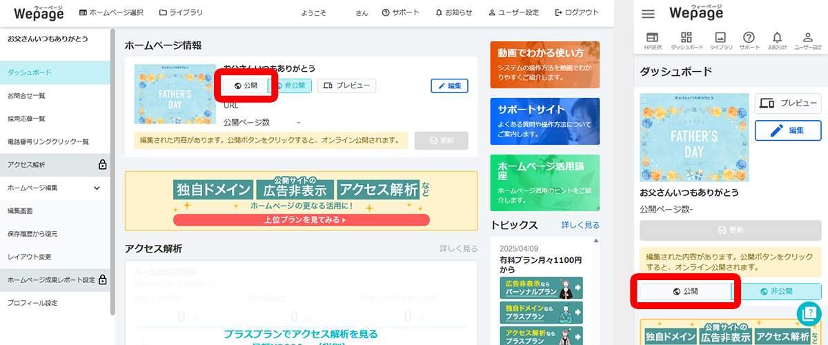 ダッシュボード画面が表示されますので、「公開」ボタンをクリックします。