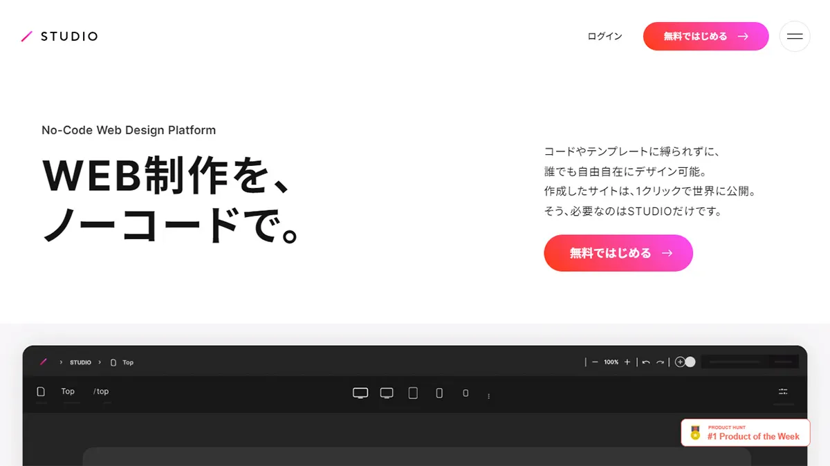 | webflow | 0円~ | 有料プランにて可能 | 2~ | - | 100種類以上 | 有料プランにて可能 | ◯ | ◯ | ◯ | ◯ | ◯ | 可能 | 可能 |